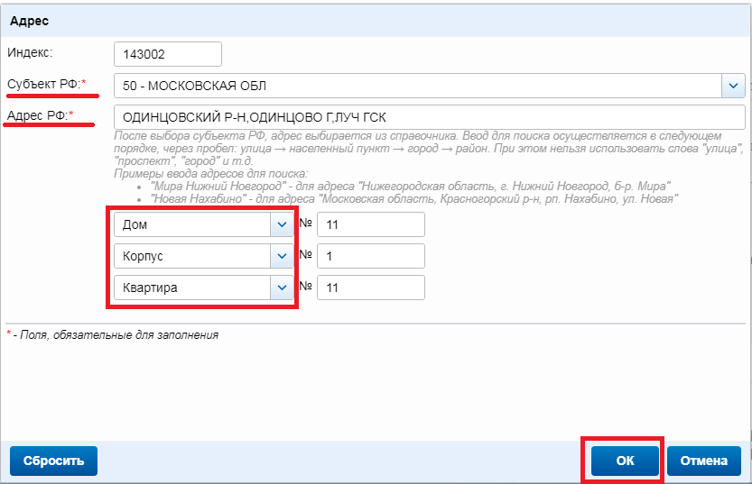Дальше укажите дом (владение, домовладение, литера), корпус (строение, строение, сооружение), квартиру (комната, помещение, офис).