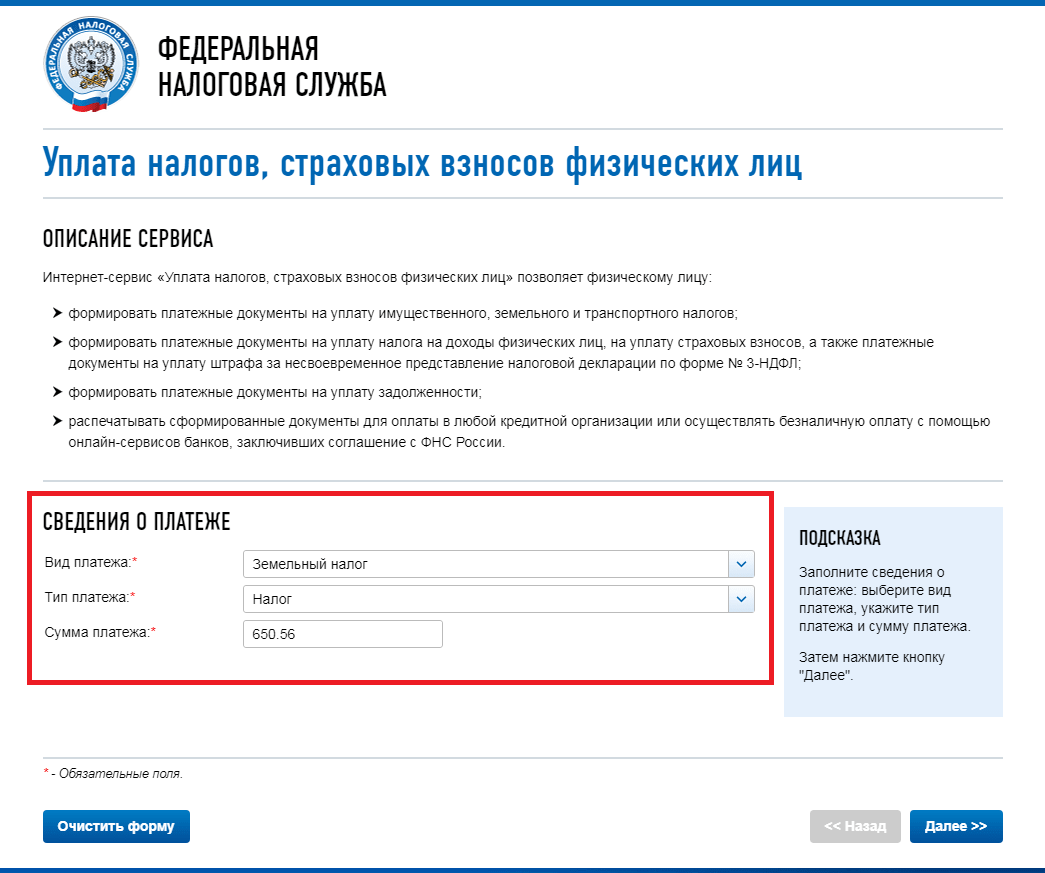 В меню вида платежа выберите «Земельный налог», укажите тип платежа — «Налог», сумму платежа согласно НУ и нажмите «Далее».