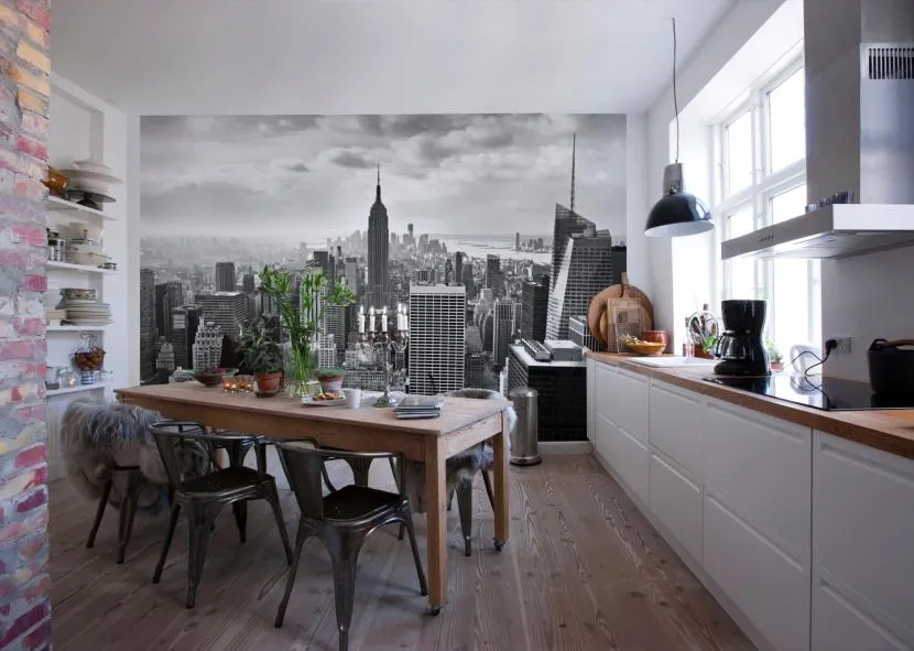 Необычный интерьер, где все дышит морем и свежестью. Фотообои на стене или фартук с морской тематикой и высокие барные стулья-табуреты в тон создадут непередаваемую атмосферу солнечного лета на вашей кухне.