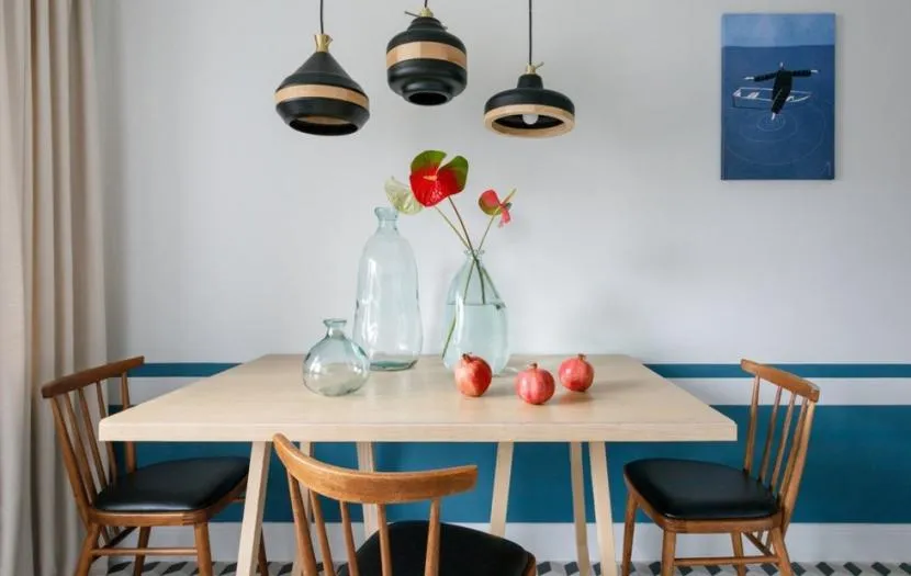 Использование метода контраста при выборе цвета стен. Если комната светлая, для стены за обеденным гарнитуром выбирается тёмный или сочный оттенок. Если остальные стены тёмные, стену за столом делают светлой или яркой.