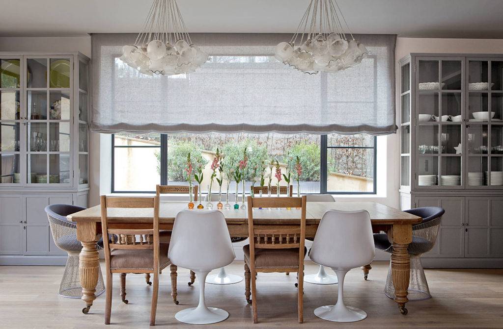 Классический стиль. Подойдёт мебель чётких геометрических форм и нейтральных оттенков. Любители эклектики могут попробовать сочетание разных направлений. Например, классический стол дополнят стулья в стиле ар-деко контрастной расцветки. Иногда достаточно выразительной детали: один из стульев с мягкой спинкой можно заменить креслом с обивкой капитоне.
