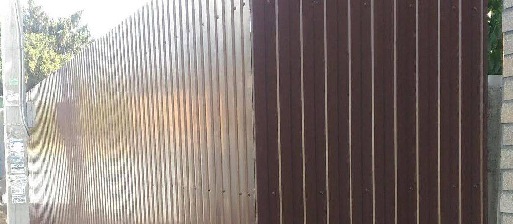 Строился забор от соседей и фронтальный. Общая длина 50 метров, высота 2,5 м. На фронтальный использован коричневый профлист, на меже — оцинкованный, толщина 0,5 мм, марка С8.