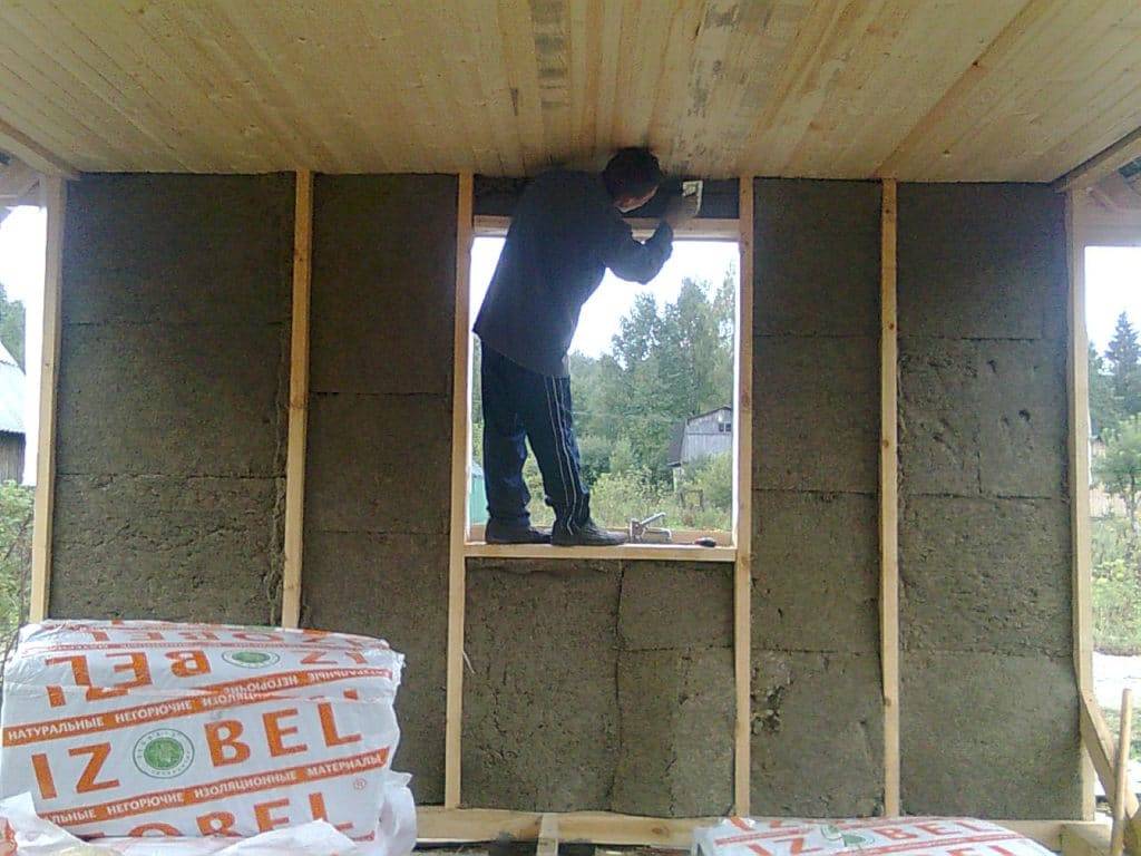 - Потом на стены укрепляется каркас из деревянных брусьев.