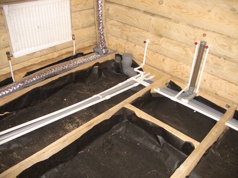 Если высота помещения позволяет или нет другого способа, то существующий настил используют как черновой пол. Чаще всего это уложенные на лаги доски. На них крепится брус по аналогии с каркасом для стен. Но он должен иметь достаточное сечение, чтобы выдерживать нагрузки. Между новыми лагами прокладывают утеплитель, закрывают его гидроизоляцией и устраивают чистовой настил.