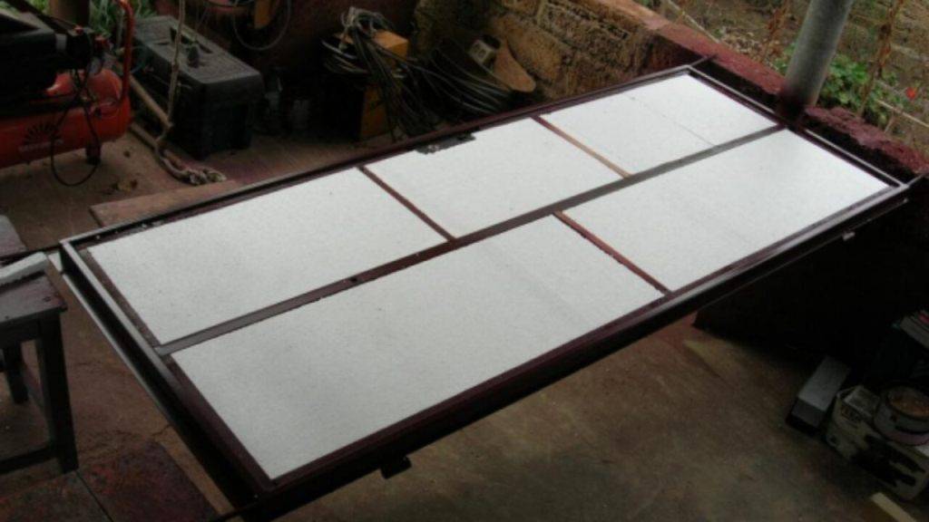 - На деревянный щит прибивают листы изоляции снаружи и изнутри, расстояние между гвоздями 10 – 15 см.