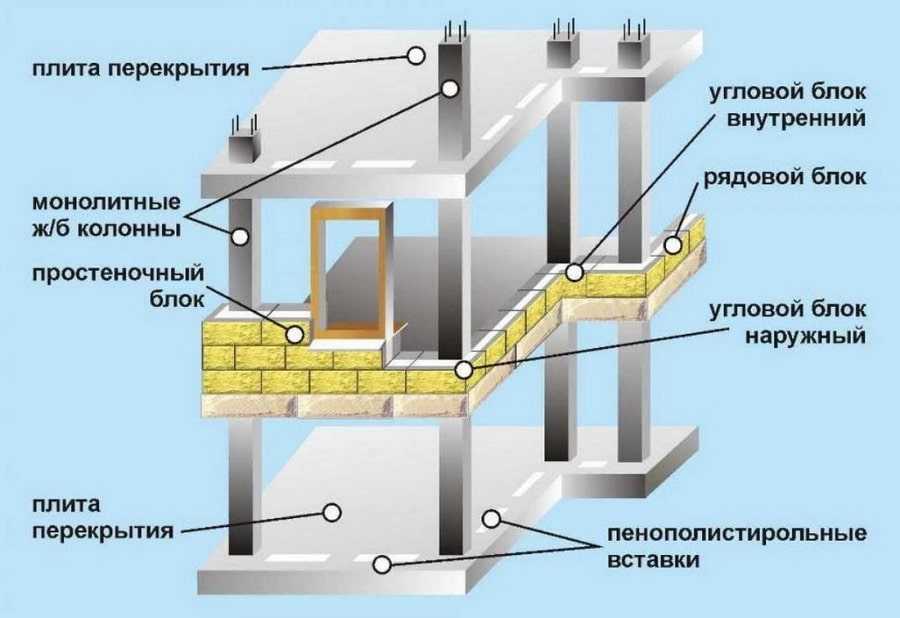 - Монолитно-каркасный – в роли каркасных элементов выступают железобетонные колонны и перекрытия. Наполнением опалубки может стать не только бетон, но и кирпич.