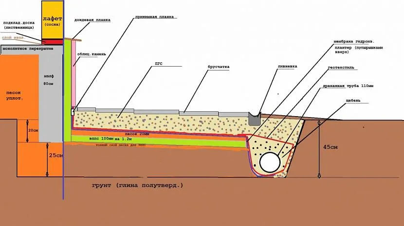 Укладывается подобная защитная полоса вблизи любого строения намного быстрее бетонной, да и прослужит она долгое время (50 и более лет).