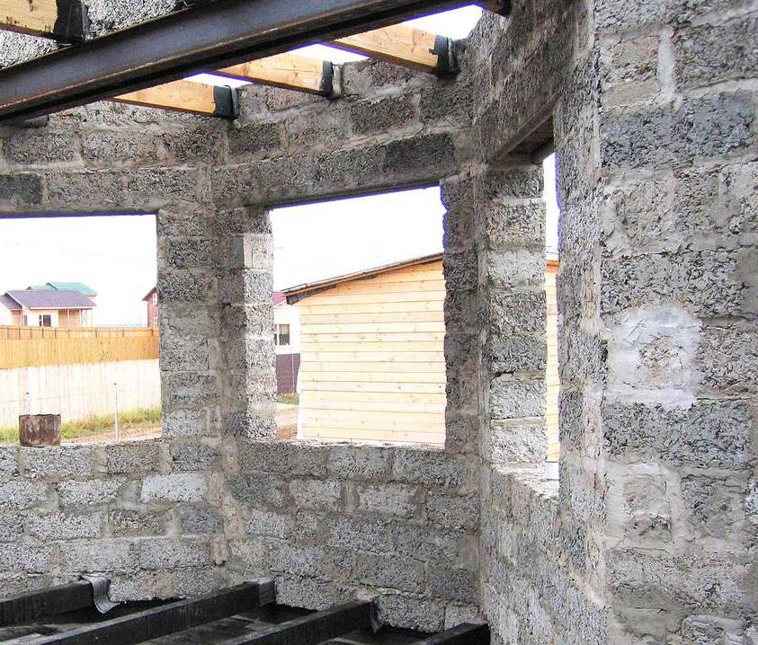 Над последним рядом блоков укладываются балки перекрытий. Из-за особенностей здание из него почти не дает осадку, поэтому после обустройства крыши можно сразу же провести финишную отделку с помощью любых отделочных материалов.
