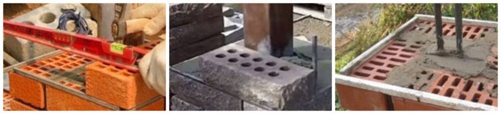 Последующая кладка производится по той же схеме: три ряда столбов, три ряда пролета, армирование. Продолжать, пока кладка не достигнет нужной высоты.