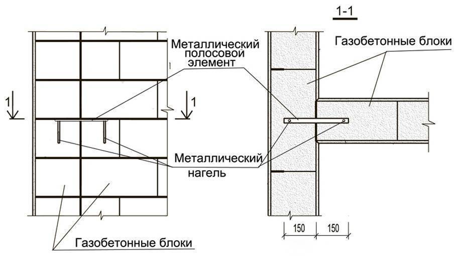 При соединении продольных и поперечных газоблочных стен встык необходимо выполнять фиксацию кладки Т-образными, Г-образными анкерами, накладками из полосовой стали δ 3 мм или металлическими скобами Ø 4-6 мм. Связи закладываются в швы через каждые два-три ряда кладки, но не менее 2х элементов на этаж.