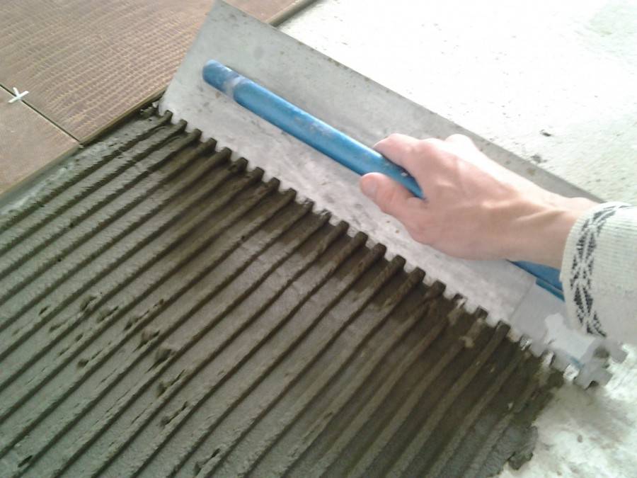 - Изготавливаем смесь согласно инструкции. Наносим смесь с помощью зубчатого шпателя. И толщина прослойки обязана являться одному-трём миллиметрам.