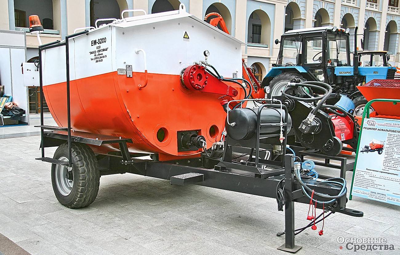 Рециклер ЕМ-3200 применяют для ремонта дорог технологией литого асфальта. Особенность: устройство прицепного типа, нужна автотракторная техника для передвижения. Загружает готовые смеси литого асфальта, доставляет смесь к месту работ. Перерабатывает старые фракции асфальта, готовит литые смеси из инертных материалов, транспортирует горячий битум (вещество, которое применяют в дорожном строительстве). Основные характеристики:
