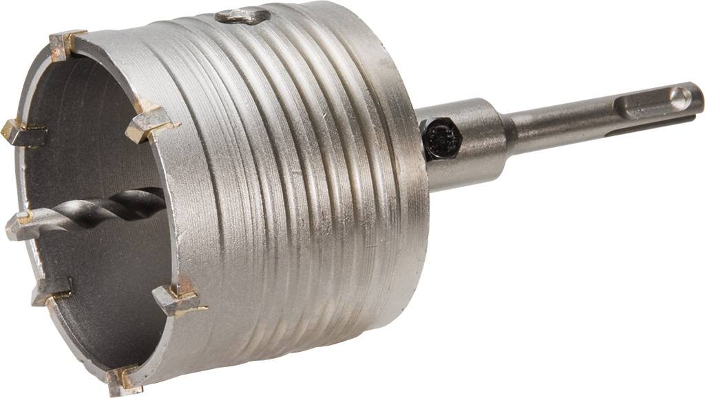 К первой группе относятся изделия с поликристаллическими алмазами, закрепленными в матрице. Они используются для создания отверстий и канавок в бетоне по безударной технологии. В данном случае отсутствует вибрация. Алмазная коронка для бетона с хвостовиком SDS и режущими зубцами, наоборот, применяется там, где нет ограничений по интенсивности ударной силы. Такая насадка позволяет создать отверстия диаметром до 100 мм.