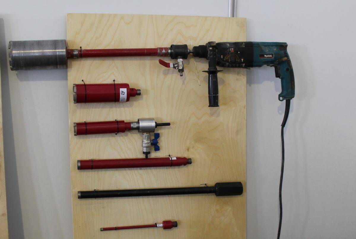 - А вот алмазное бурение отверстий в бетоне не нуждается в ударе — оно происходит по тому же принципу, что и резка железобетона алмазными кругами — путём абразивного перетирания обрабатываемого материала. Кроме того, алмазные корончатые фрезы очень удобно использовать при наличии на поверхности облицовочного материала, а также для сверления отверстий большого диаметра.
