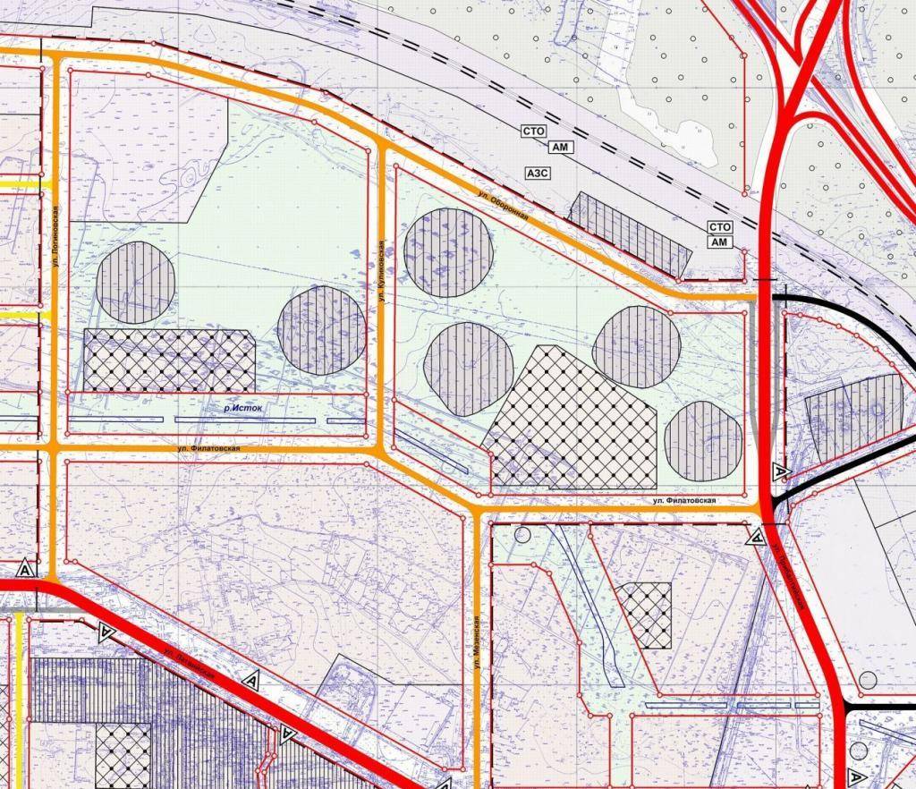 - Условное разделение магистралей, дорог, площадей от иных территорий, используемых под застройку.