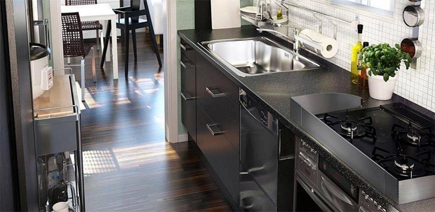 Этот вид планировки предполагает собой параллельное расположение зон для работы. Эта планировка применяется в случае большого и длинного помещения, в обратном случае на кухне сложно будет работать даже двум людям.