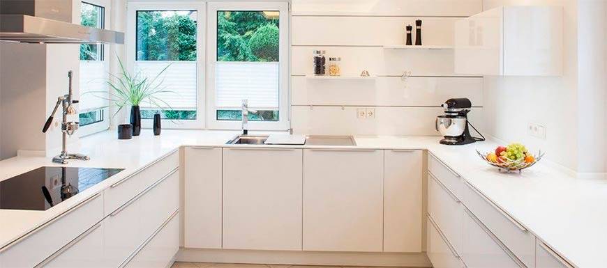 Основные достоинства углового и параллельного размещения мебели в кухне объединяет в себе именно этот вариант. Он хорошо подходит для широких помещений.