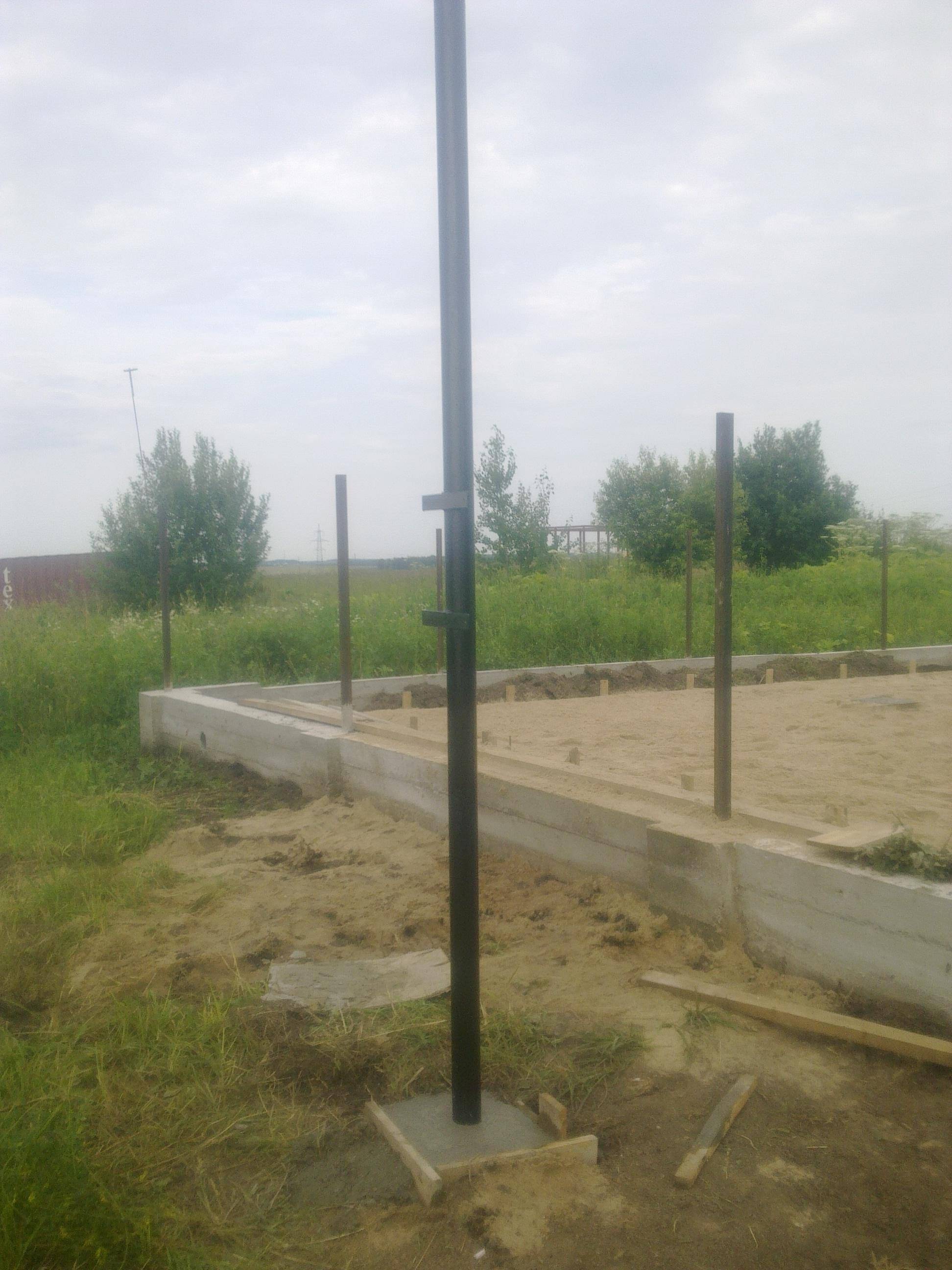 Далее для каждой опоры выкапывается квадрат, куда для укрепления дополнительно вкопать металлическую трубу или профиль необходимой высоты. Опора скрепится с основным фундаментом, когда будет происходить окончательная заливка траншеи.