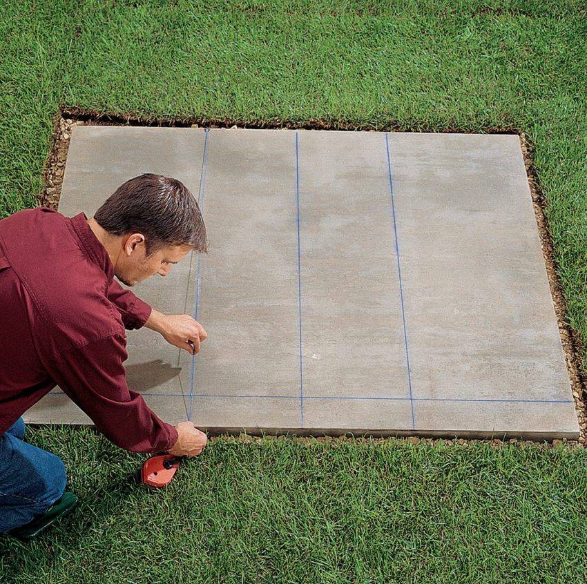 - Разметить размеры и форму, учесть необходимость дорожки для удобного подхода, место для размещения стола и стульев (диванов, шезлонгов) и прочего.