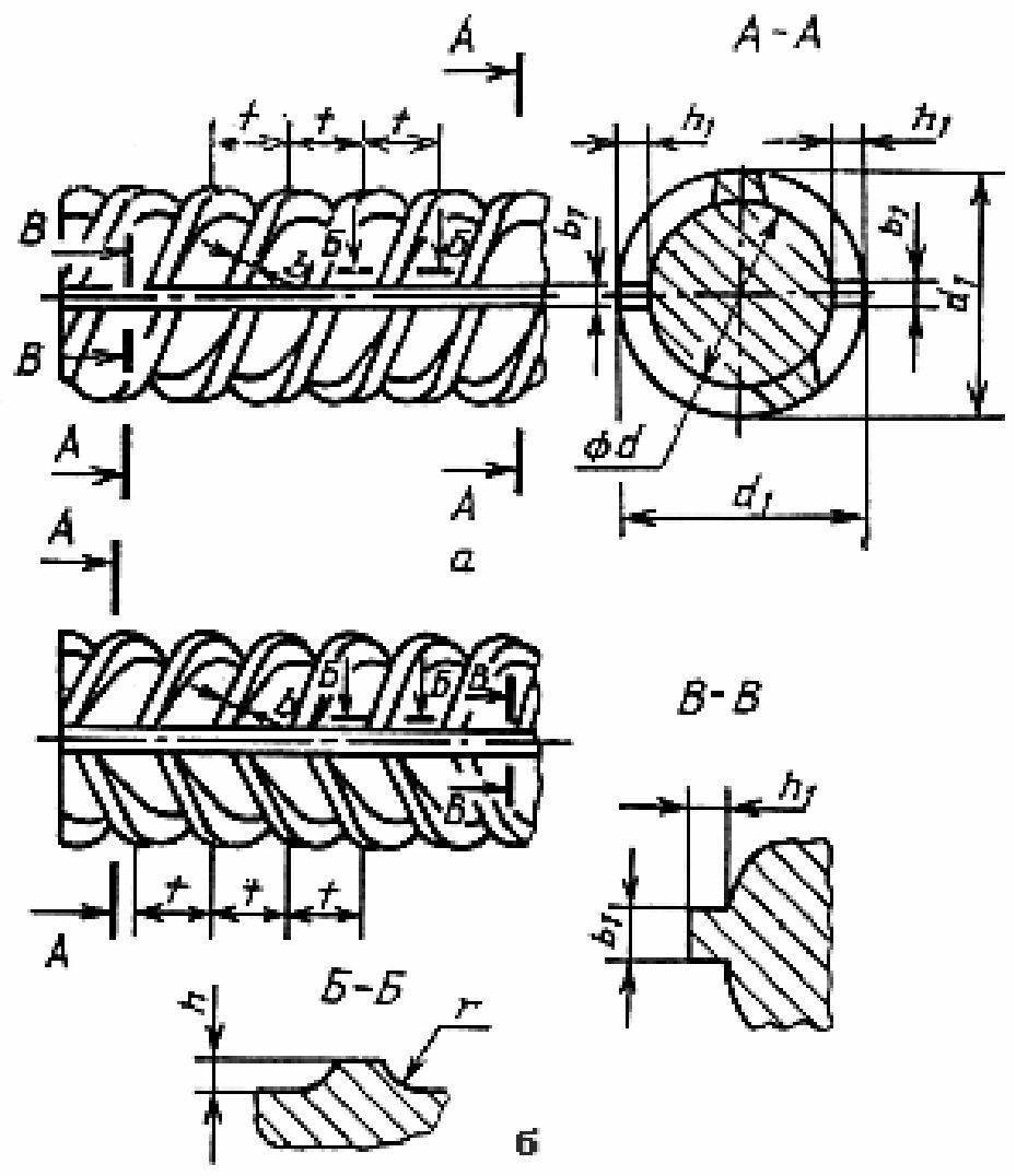 Сталь класса А-III (А400), изготовляемая профилем, приведенным на черт. 1б, и классов А-IV (А600), А-V (А800), А-VI (А1000) профилем, приведенным на черт. 1б, 2б, должна иметь выступы по винтовым линиям, имеющим с одной стороны профиля правый, а с другой – левыйзаходы.