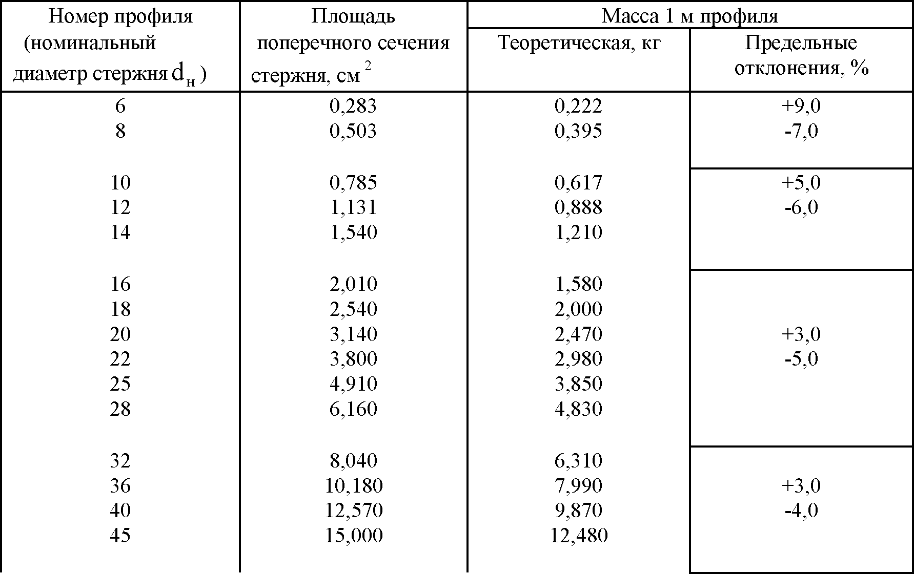 1.3. Номера профилей, площади поперечного сечения, масса 1 м длины арматурной сталигладкого и периодического профиля, а также предельные отклонения по массе дляпериодических профилей должны соответствовать указанным в табл. 1.