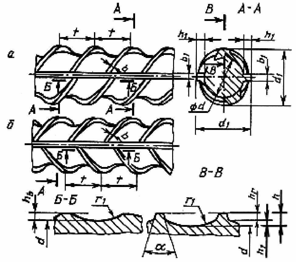 1.7. Арматурная сталь периодического профиля представляет собой круглые профили сдвумя продольными ребрами и поперечными выступами, идущими по трехзаходной винтовойлинии. Для профилей диаметром 6 мм допускаются выступы, идущие по однозаходнойвинтовой линии, диаметром 8 мм – по двухзаходной винтовой линии.