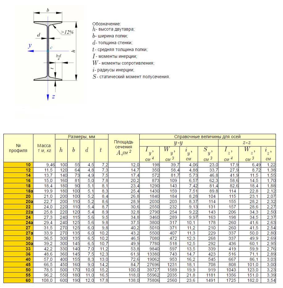 Для каркаса потолочных перекрытий малогабаритных частных домов обычно используется двутавр 10 – 20 номеров. Характеристики этих профилей приводятся в ГОСТ 8239-72 – их линейные размеры, площади сечения, максимальные моменты сопротивления по вертикали Wy и минимальные моменты инерции Jy.