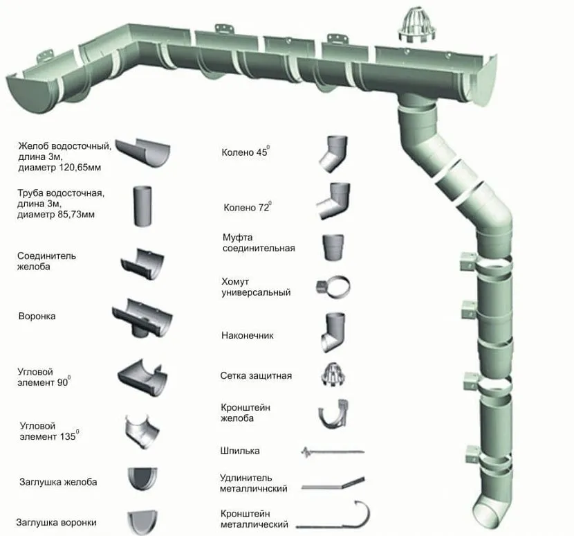Есть множество деталей, входящих в систему водостока. Их количество в каждом случае высчитывается индивидуально. Всё зависит от того, какую площадь занимает крыша.