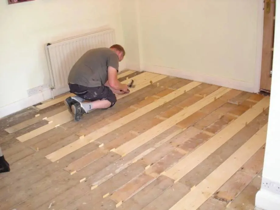 - Следует демонтировать все плинтуса вместе с элементами крепежа и отметить небольшие трещины или ямки в досках.