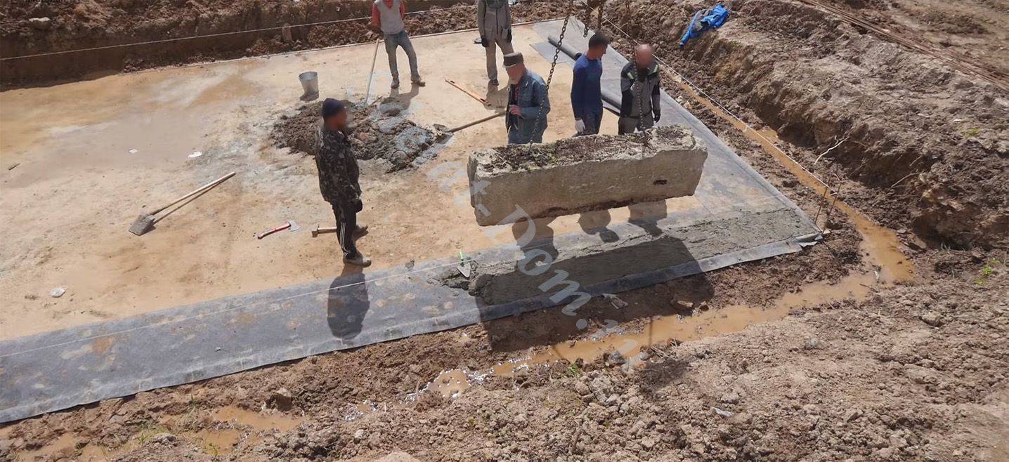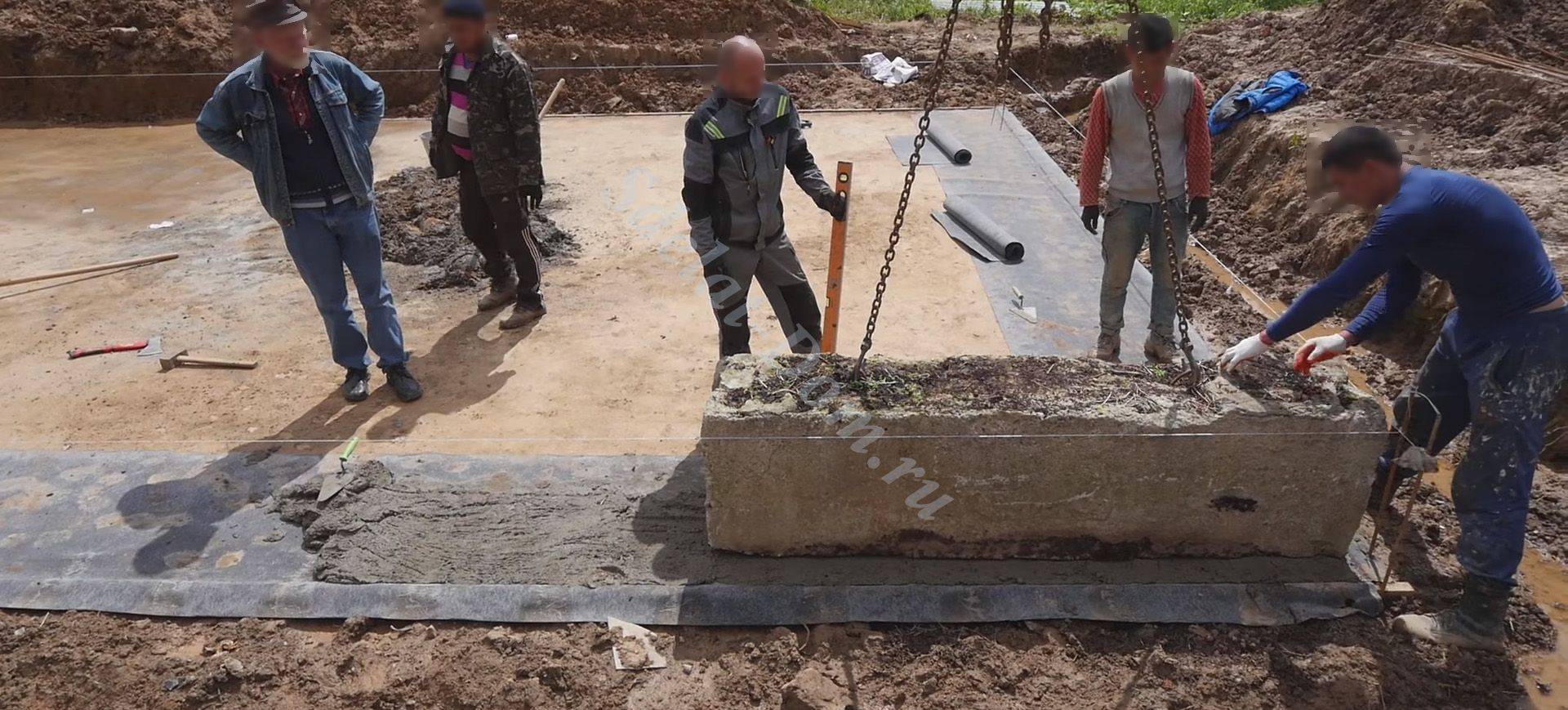 Горизонтальный гидроизолирующий слой накладывается на песчаную подушку перед процессом заливки бетонной ленты.