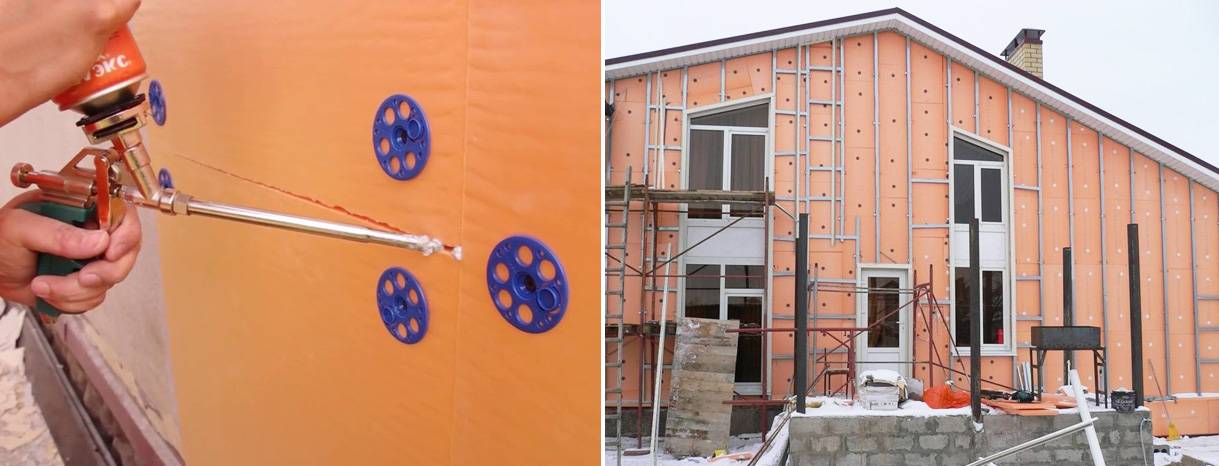 При утеплении дома снаружи минераловатными плитами, по всей стене выполняется обрешетка деревянными рейками. Толщина реек должна быть равна толщине утеплителя. Между рейками укладывается утеплитель. Сверху теплоизоляционный слой покрывают пленкой, защищающей дом от ветра и влаги. Поверх пленки и утеплителя делают еще одну обрешетку, на которой будет закрепляться сайдинг.