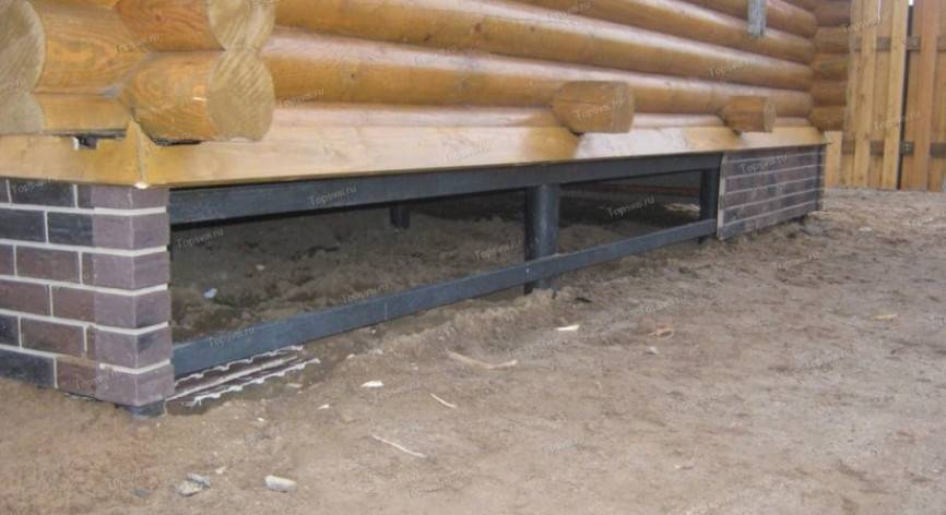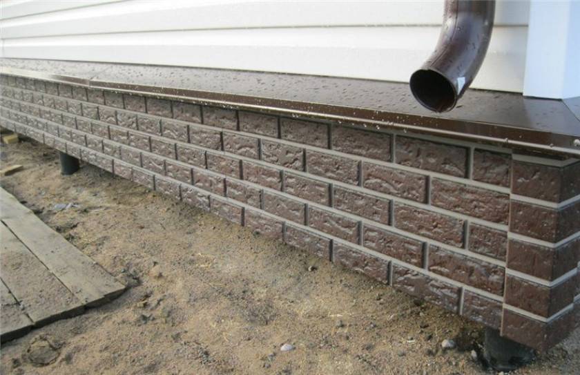 При 1-ом варианте вырывают траншею по периметру фундамента. Углубление армируют и заливают бетоном. Поверх застывшего основания кладут кирпич, прикрывают его изоляцией. Минифундамент заслоняют декоративными панелями.