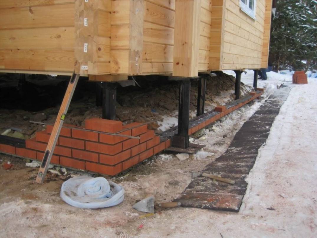 Приступают к подвальным коммуникациям после того, как подготовлена основа свайного фундамента. В этом случае кирпичи, просмоленные бревна или возведенные железобетонные блоки могут служить строительным материалом.