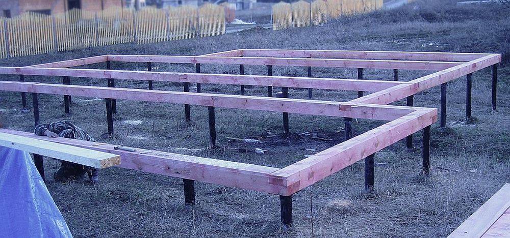 Для дальнейшего строительства требуется горизонтальный элемент, соединяющий опоры между собой и служащий опорной линией для стен дома.
