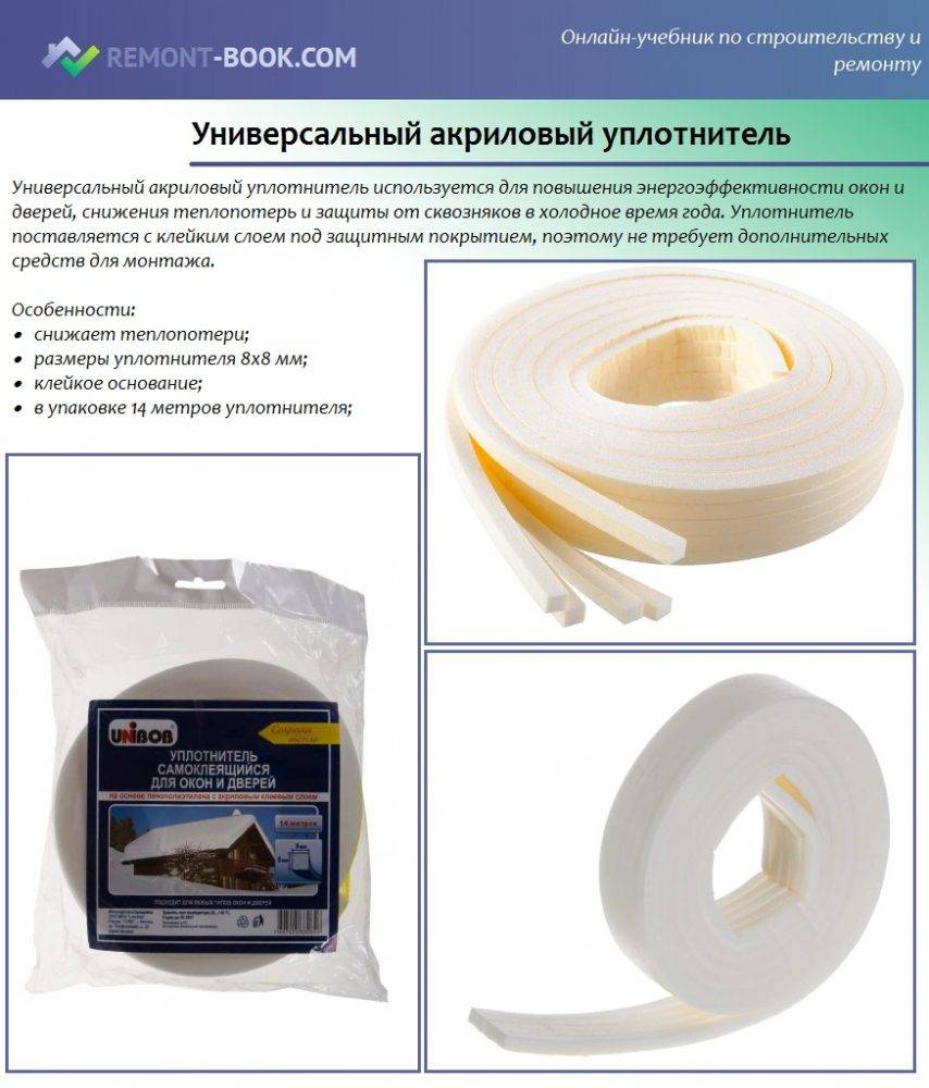 Основные материалы, из которых изготавливается утеплитель, это резина, ПВХ, поролон и пенополиэтилен. На одну из сторон утепляющей ленты нанесен клеевой состав, защищенный специальной бумагой. При нанесении утеплителя бумага снимается.