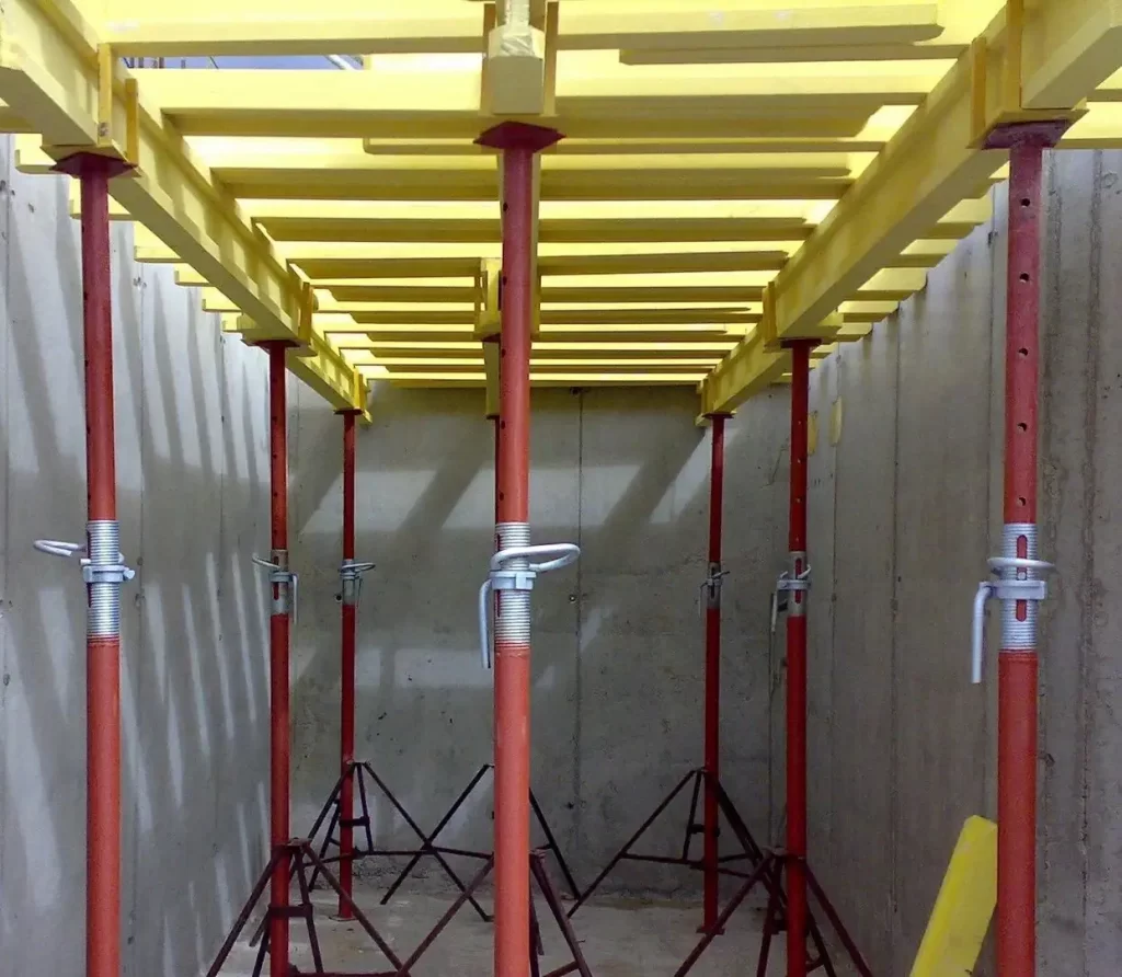 После того, как была закончена заливка колонн, можно приступать к монтажу дна опалубки несущих балок. Они крепятся в специальные пазы, имеющиеся в опалубочной конструкции колонн. Затем осуществляется монтаж поддерживающих эти элементы телескопических стоек, при значительных высотах применяют системы объемной опалубки. Опоры таких систем устанавливаются на специальные треноги, повышающие устойчивость и соединяются между собой ригелями.