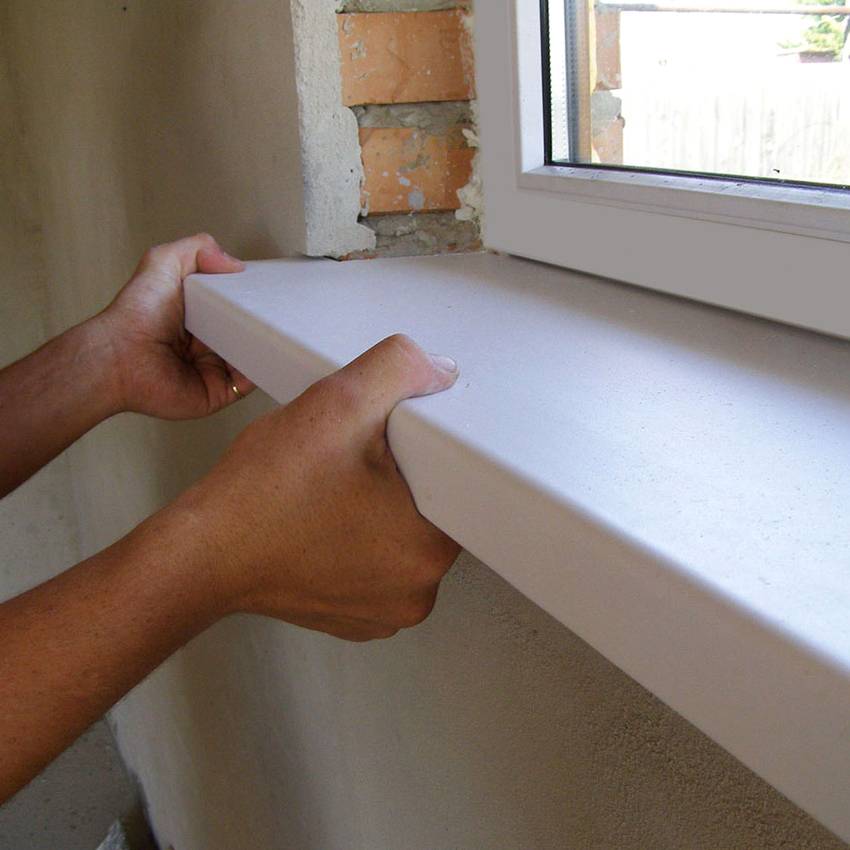 Сделайте перфоратором небольшие углубления в стене, приложите заготовку к проему и наметьте вырезы с учетом углубления. Теперь вырежьте подоконник и вставьте на предназначенное место.