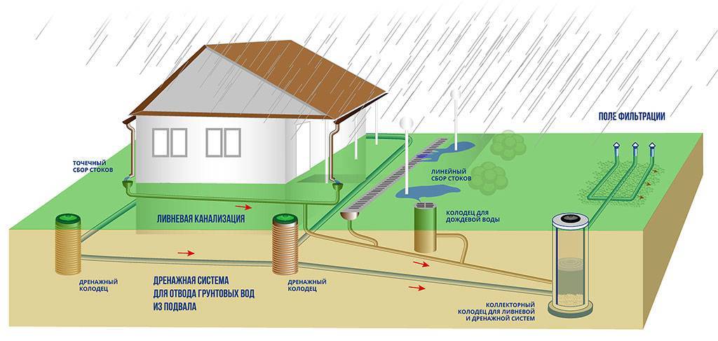 Часто вместо коллектора используются вышеперечисленные колодцы большого размера. В них еще можно осуществлять сбор дождевой воды и отводить ее к точкам сброса.