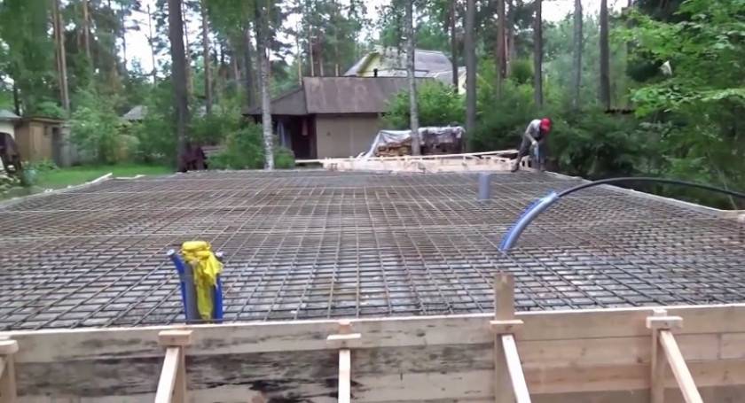 - Армирование. В зависимости от удельного веса строения рассчитывают толщину бетонной плиты, и подбирают диаметр арматуры.