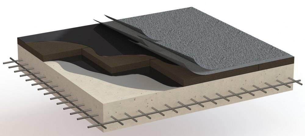 - Плоское основание, выполненное из бетонных плит или листов профилированного металла. Оно обеспечивает жесткость конструкции, несет на себе вес кровельного пирога, передавая его несущим перегородкам и, в итоге, фундаменту. У эксплуатируемой кровли основание должно быть максимально жестким.