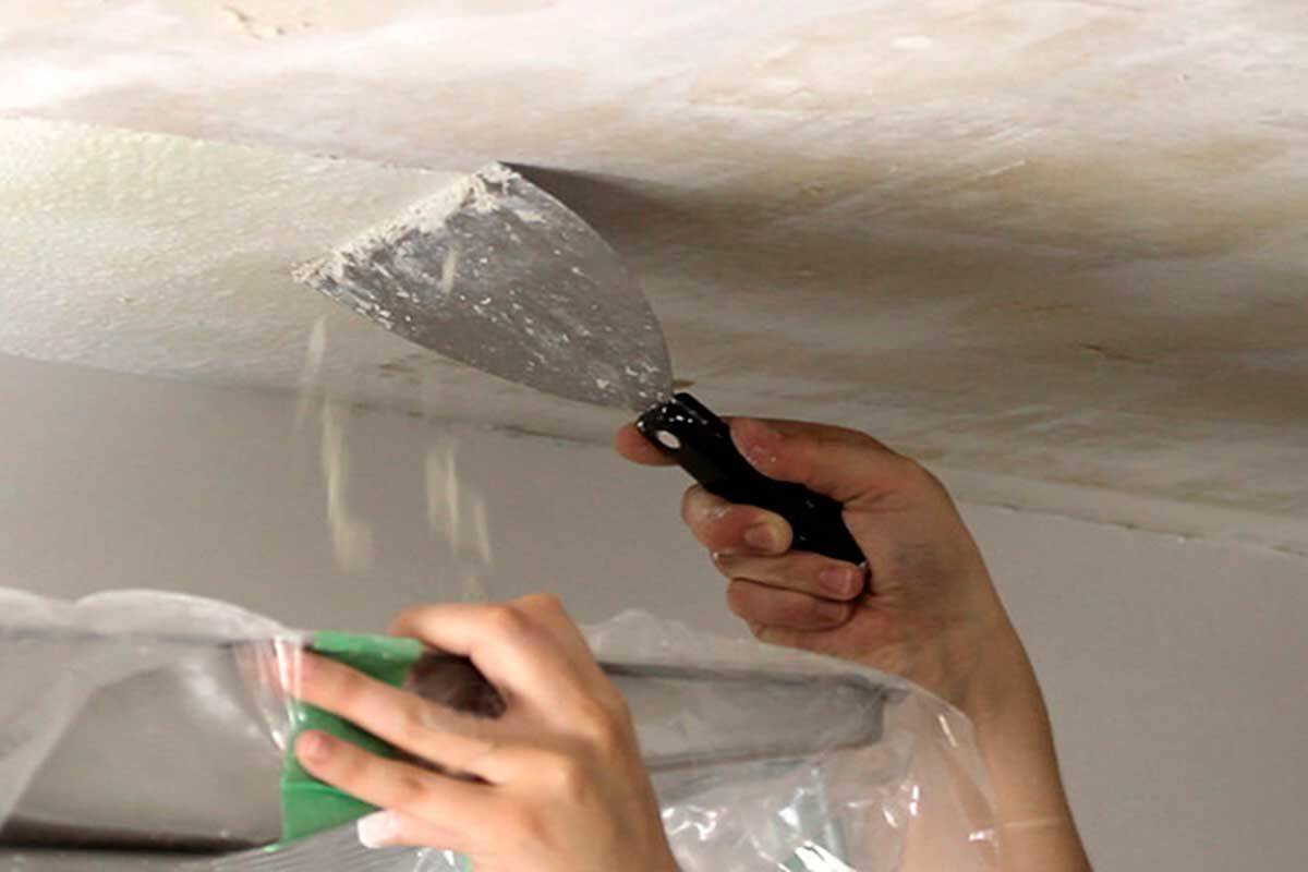 - Толстый слой можно снять при помощи жидко сваренного клейстера. Его наносят на потолок и оставляют для воздействия на 20 минут. После этого клейстер снимают шпателем. Данный способ хорош тем, что счищая таким образом, удается избежать образования большого количества пыли.
