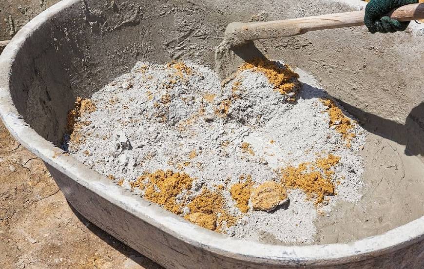 Для приготовления небольшой порции бетона, Вам понадобится емкость (например, корыто или старая ванна) и небольшая лопата для перемешивания. Смешивание следует делать так: