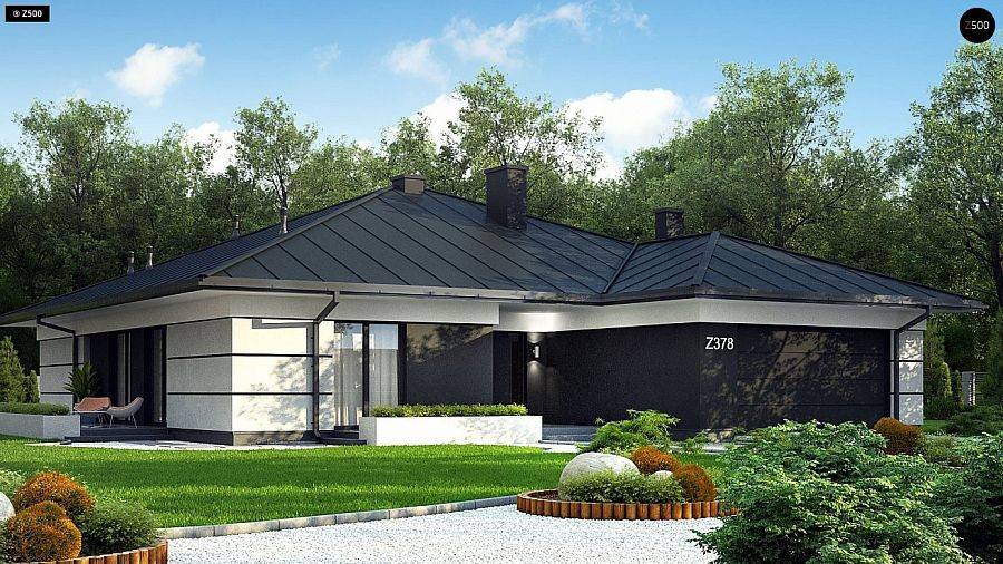 Представляем проект дома с большой террасой под одной крышей. Такой дом словно бунгало, в котором будет комфортно жить семье из пяти человек. Особенность постройки – выразительный внешний вид с ломаной геометрией, а также с удачным сочетанием черного, светло-серого и белого покрытия стен. Плюс необычная приземистая крыша.