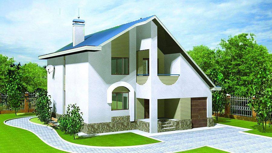 Простой проект дома, но с грамотной планировкой и лаконичным дизайном. Легкий и при этом оригинальный вид фасаду постройки придает ассиметричная крыша. Также нельзя не отметить и еще одно украшение дома – это вертикальная линия остекления, которая разбавлена арочными вкраплениями. Цвет для отделки подбирается с учетом пожеланий заказчиков.