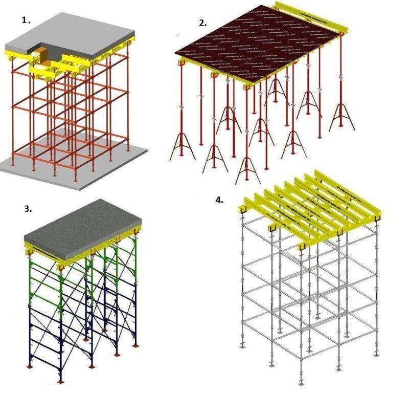 Вне зависимости от материалов горизонтальной основы конструкция опалубки удерживается стойками.
