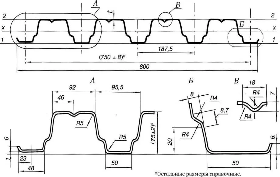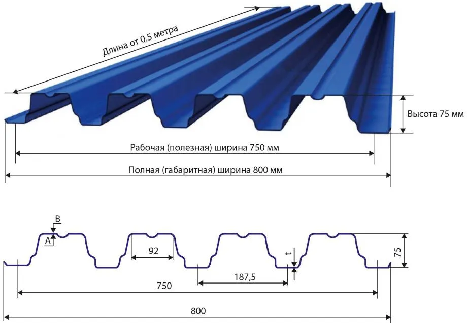 - Число 75 – высота трапеции (в мм). Высокий профиль предоставляет дополнительные преимущества для кровли: он хорошо ложится на разреженную обрешетку, к тому же быстро отводит воду с крыши.