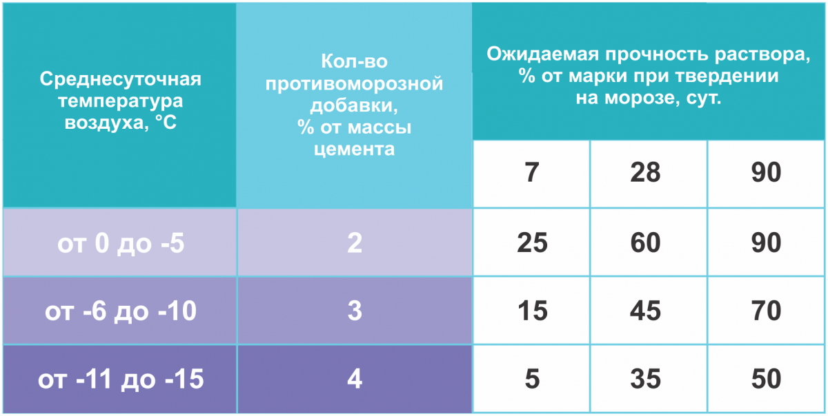 Антифризы добавляют в концентрации 10-15% от массы раствора; усилители отвердевания – 3-5% от массы цемента; соли-ускорители – 2-4% от общей массы.