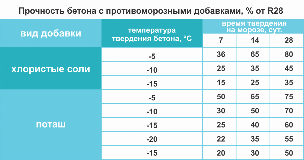 Важно: нельзя использовать для приготовления бетона замёрзший заполнитель. Температура готовой смеси должна быть на 5 градусов выше, чем заданная точка замерзания водного раствора с антиморозной присадкой