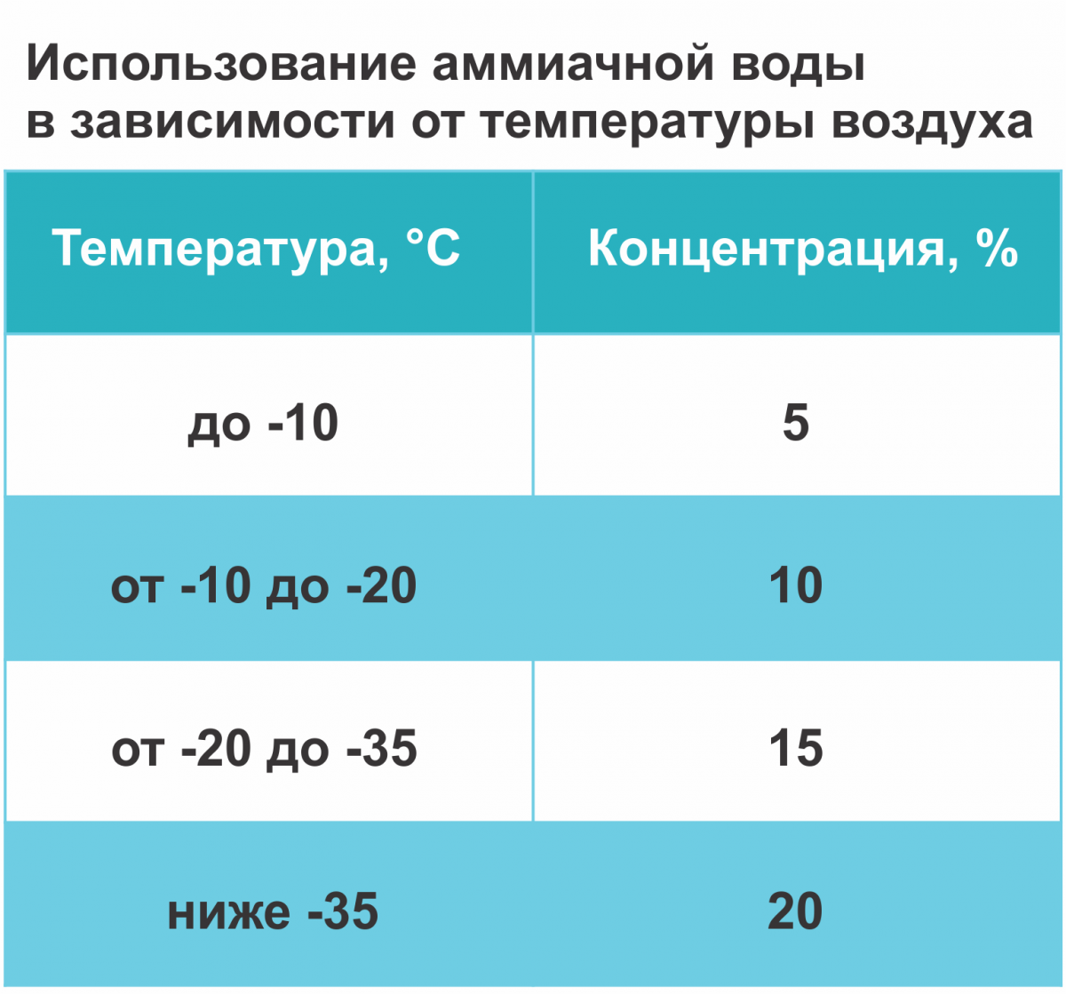 - при температуре до -10 °С рекомендуется использовать 5% раствор аммиачной воды;