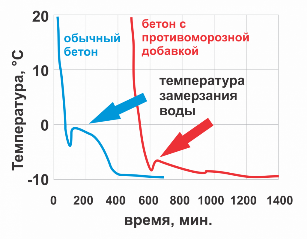 - Добавки, которые понижают температуру замерзания жидкой фазы бетона, вода не переходит в твердое состояние при -10 градусах и ниже.